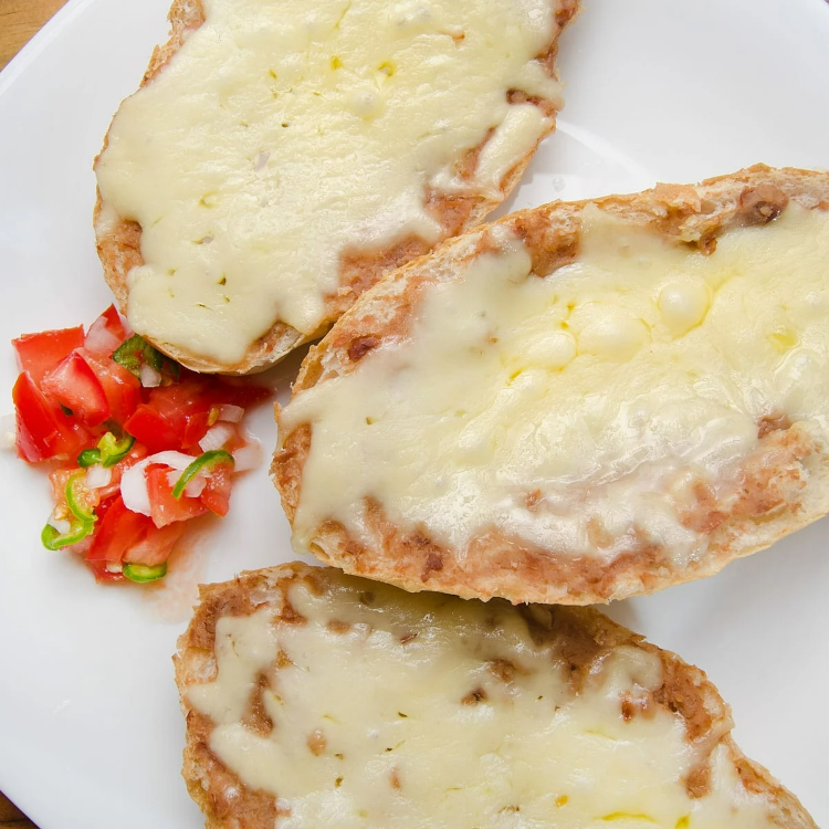 pan horneado con mantequilla, frijolitos y queso gratinado