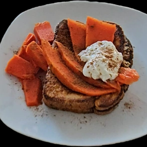 pan de masa madre salteado doradito con mantequilla canela, frutas caramelizadas bañado en miel de maple