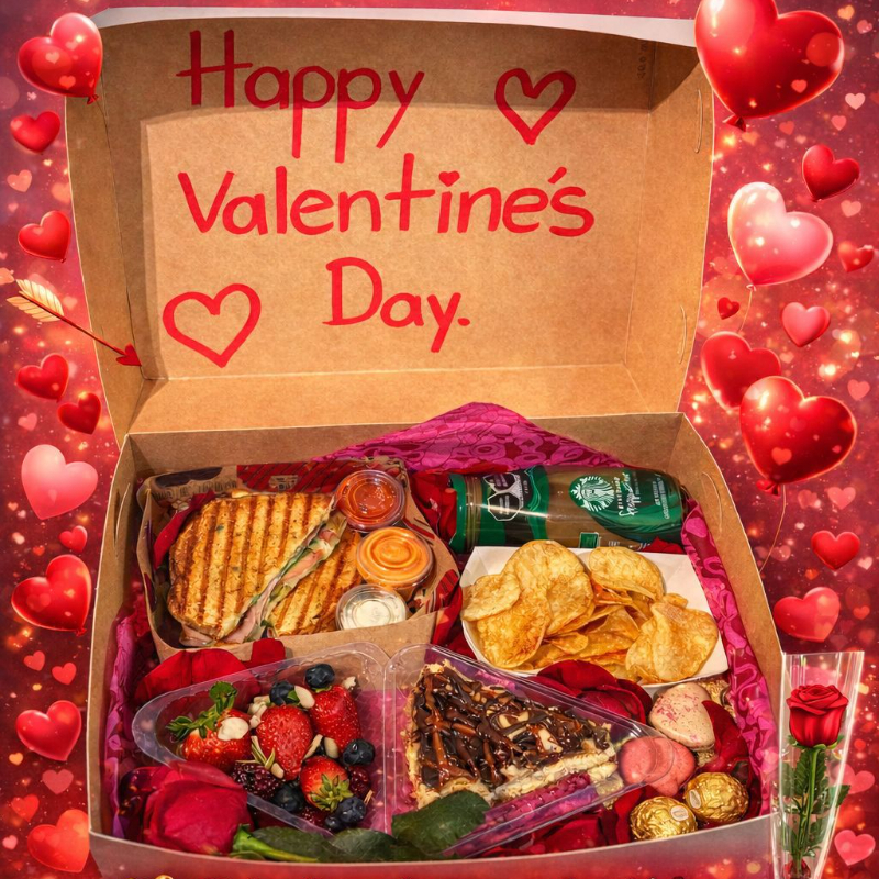 INCLUYE SANDWICH DE JAMON CON PAPAS Y ADEREZOS, UNA REBANADA DE PAY O PASTEL, FRUTA CON ALMEDRAS, UN CAFE DE STARBUCKS, MACARRONES Y FERRERO ROCHER ENTRE OTRAS COSAS