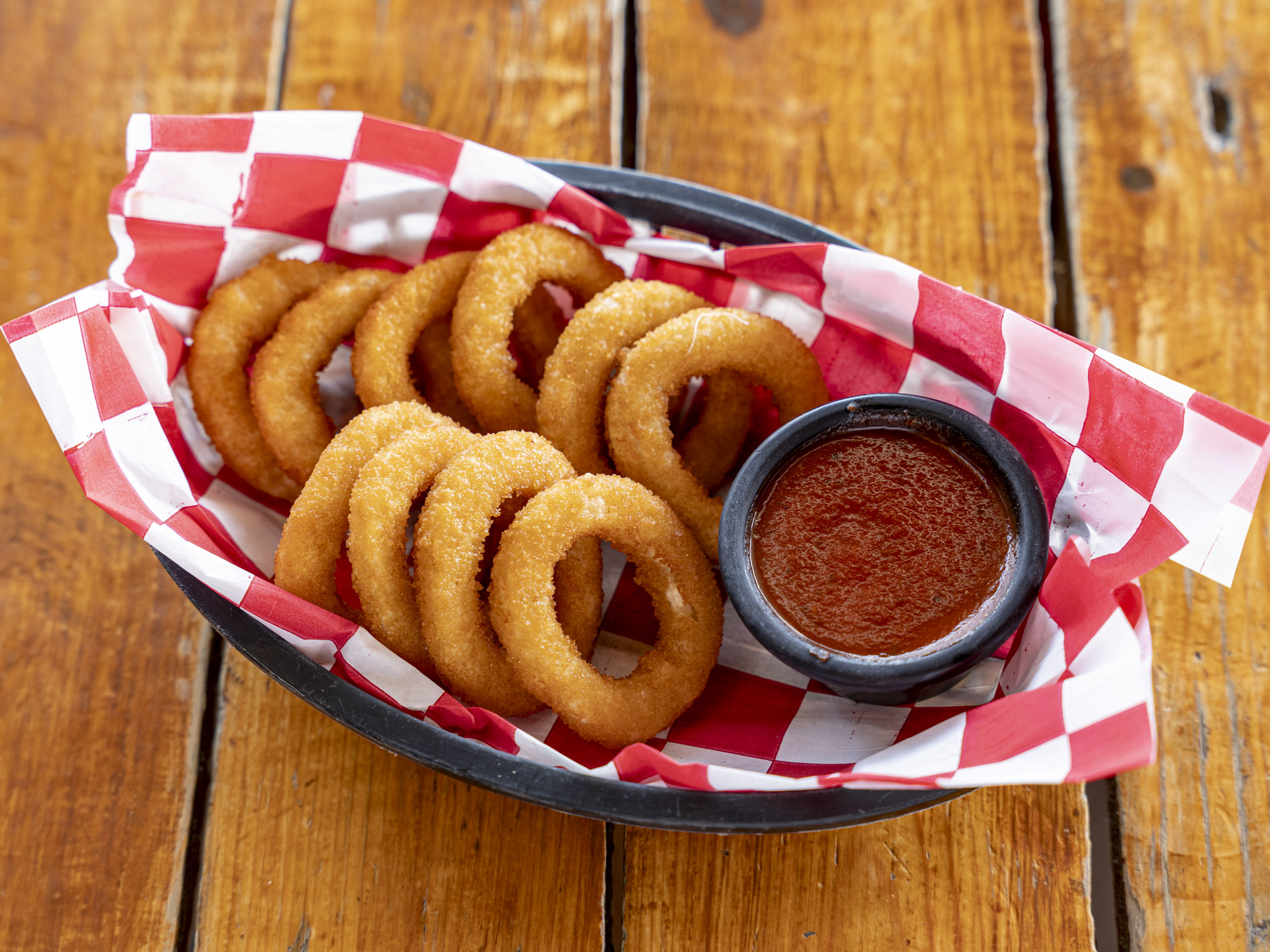 10 piezas de aros de cebolla acompañados de salsa Barbinara casera