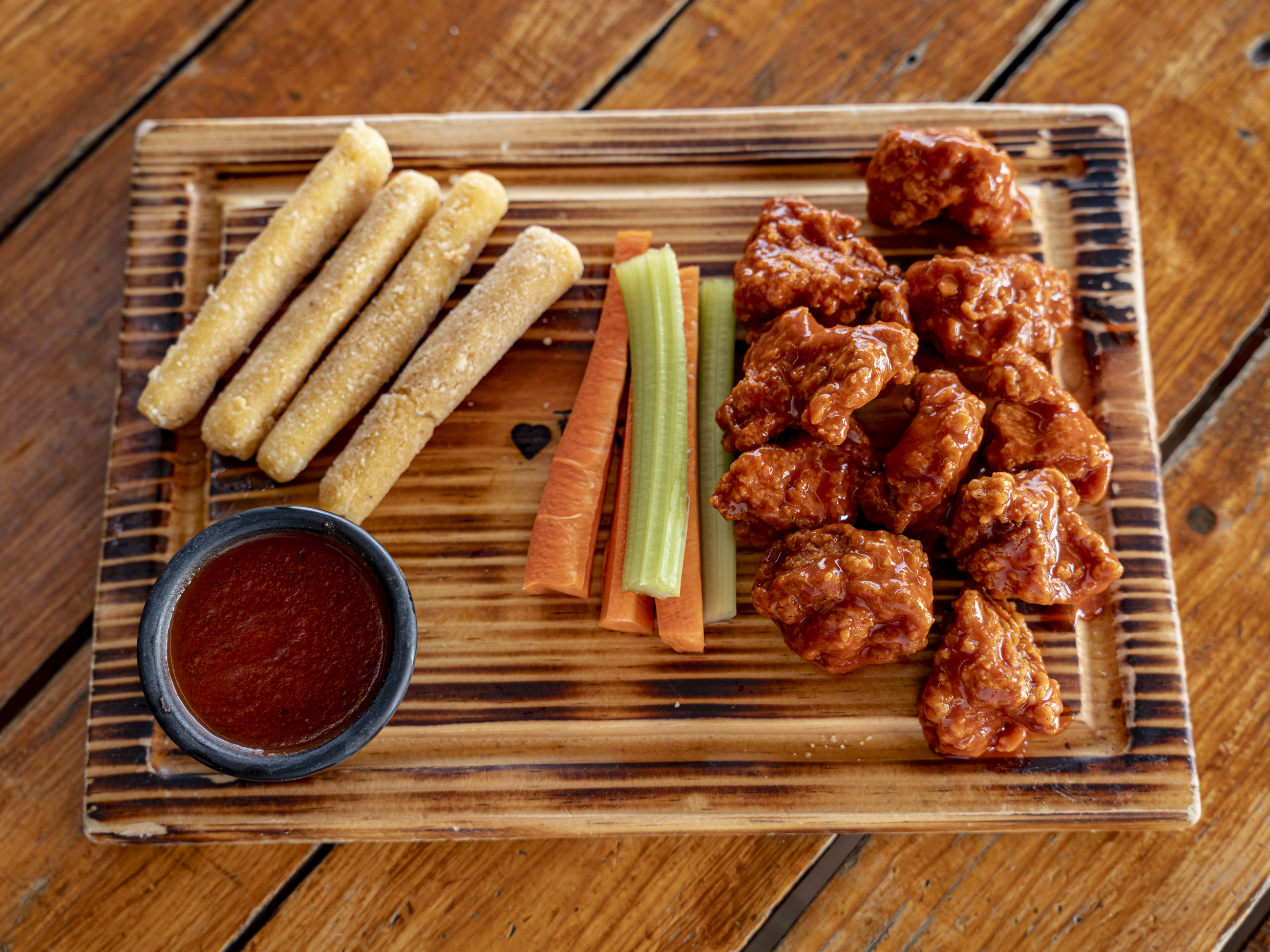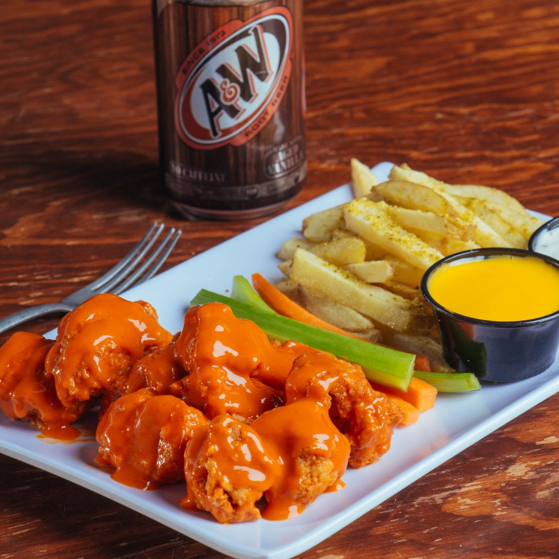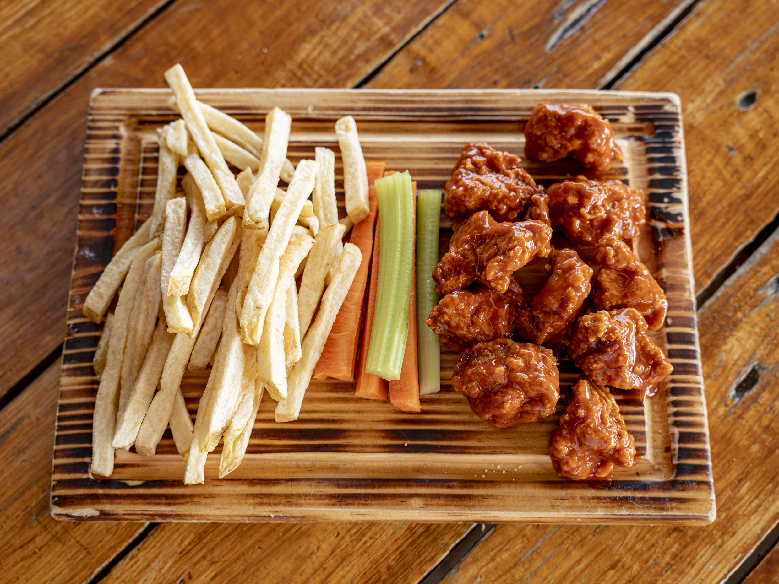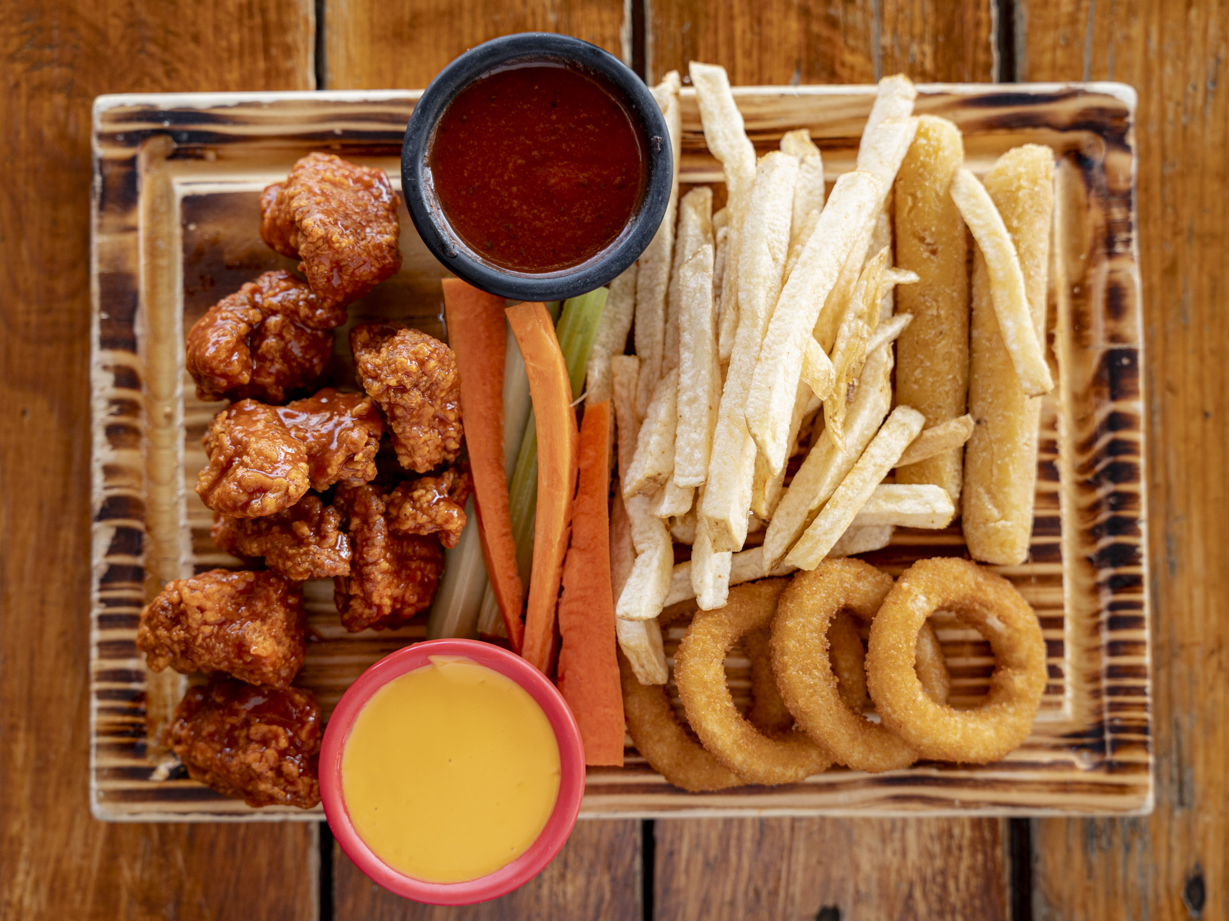 200 gr de boneless o alitas, 150gr. de papas francesas, 2 dedos de queso, 4 aros de cebolla, veggie sticks y aderezo ranch (Porcion individual.)