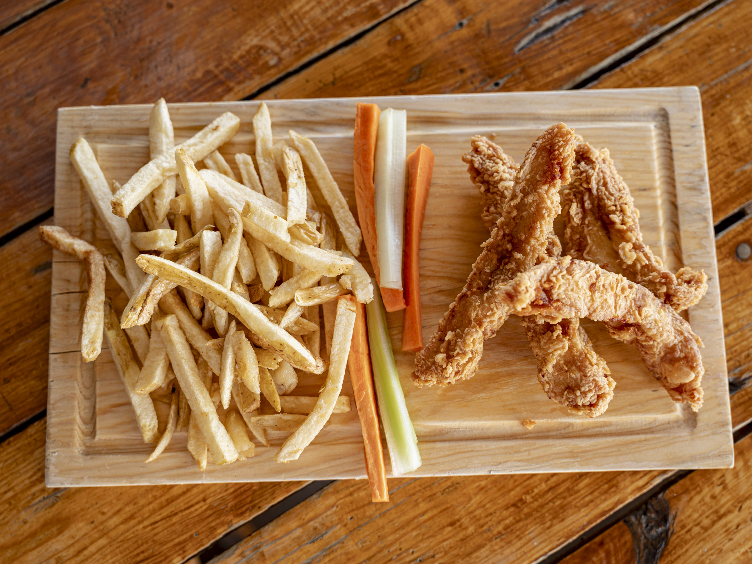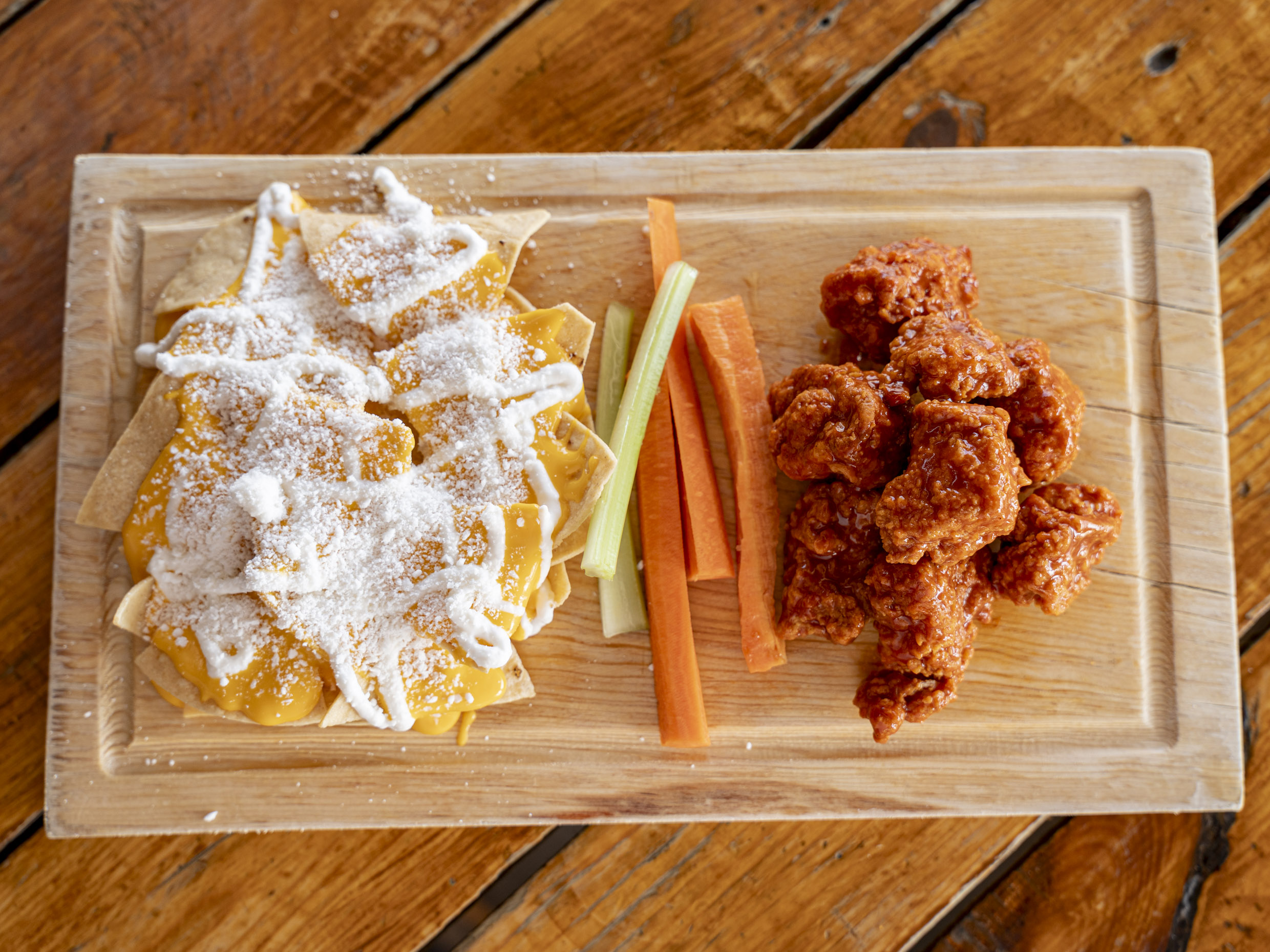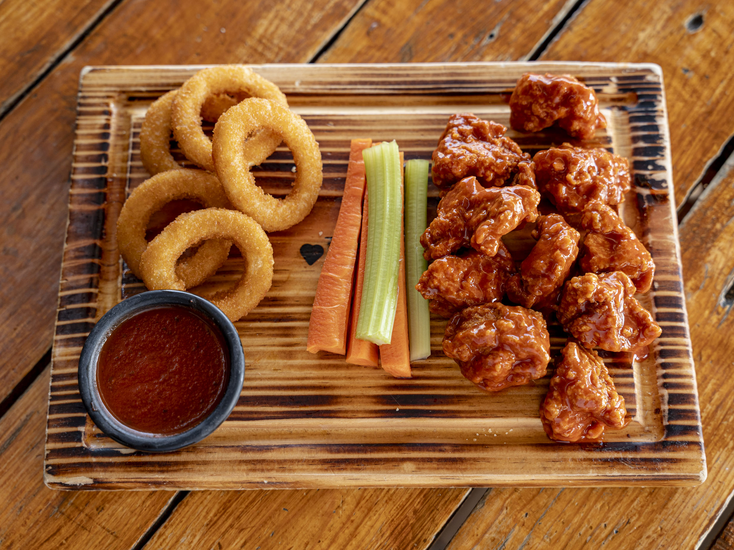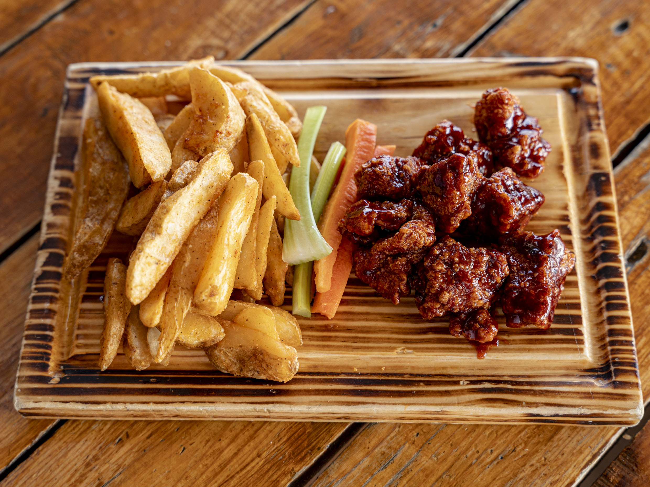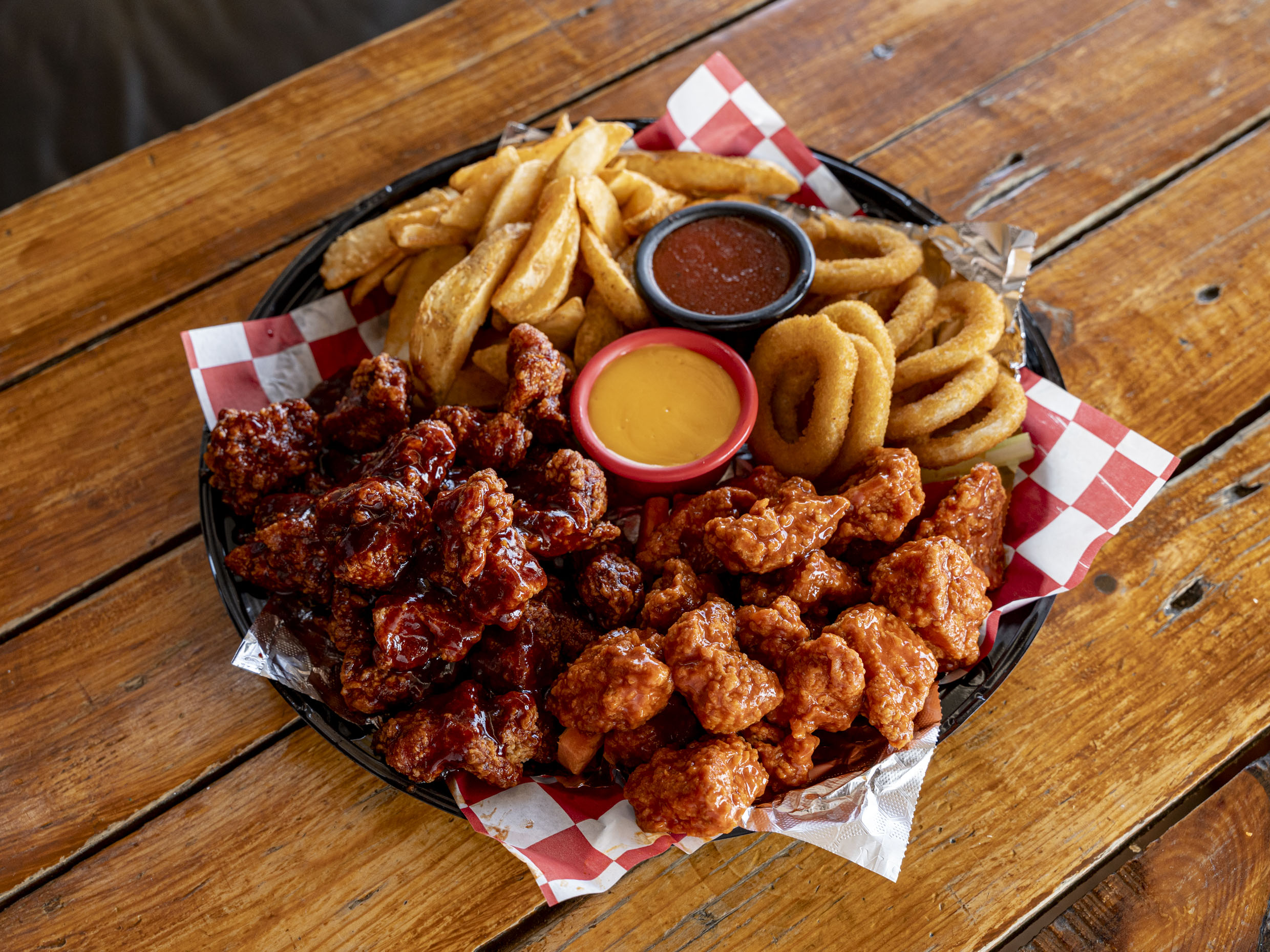 200 gr de boneless o alitas, 150gr. de papas francesas, 2 dedos de queso, 4 aros de cebolla, veggie sticks y aderezo ranch (Porcion individual.)