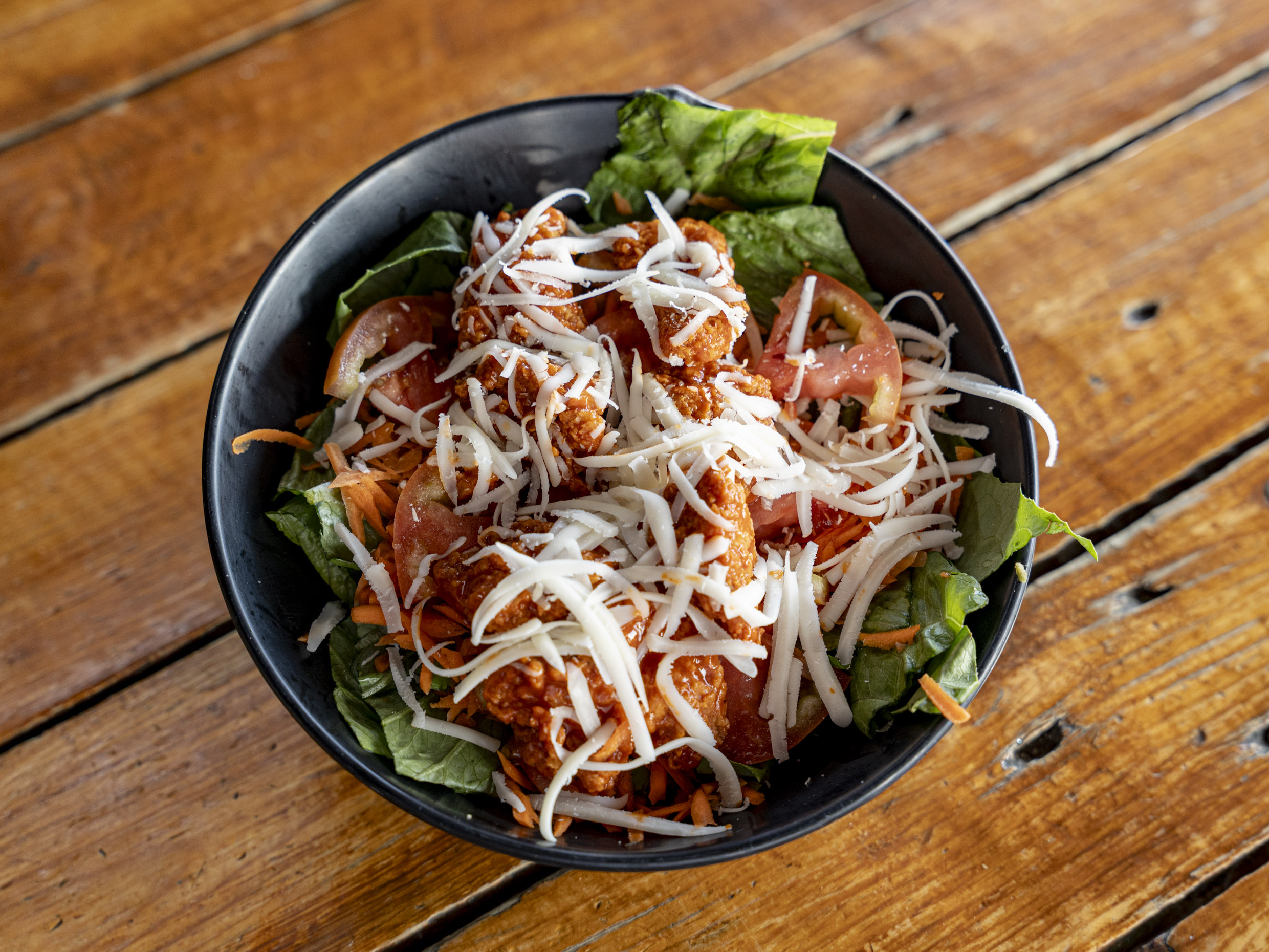 Combinación de lechuga, tomate picado, zanahoria rallada, queso rallado, Boneless (150 Gr. Aprox.) bañados en la salsa de tu elección, con aderezo Ranch aparte.
