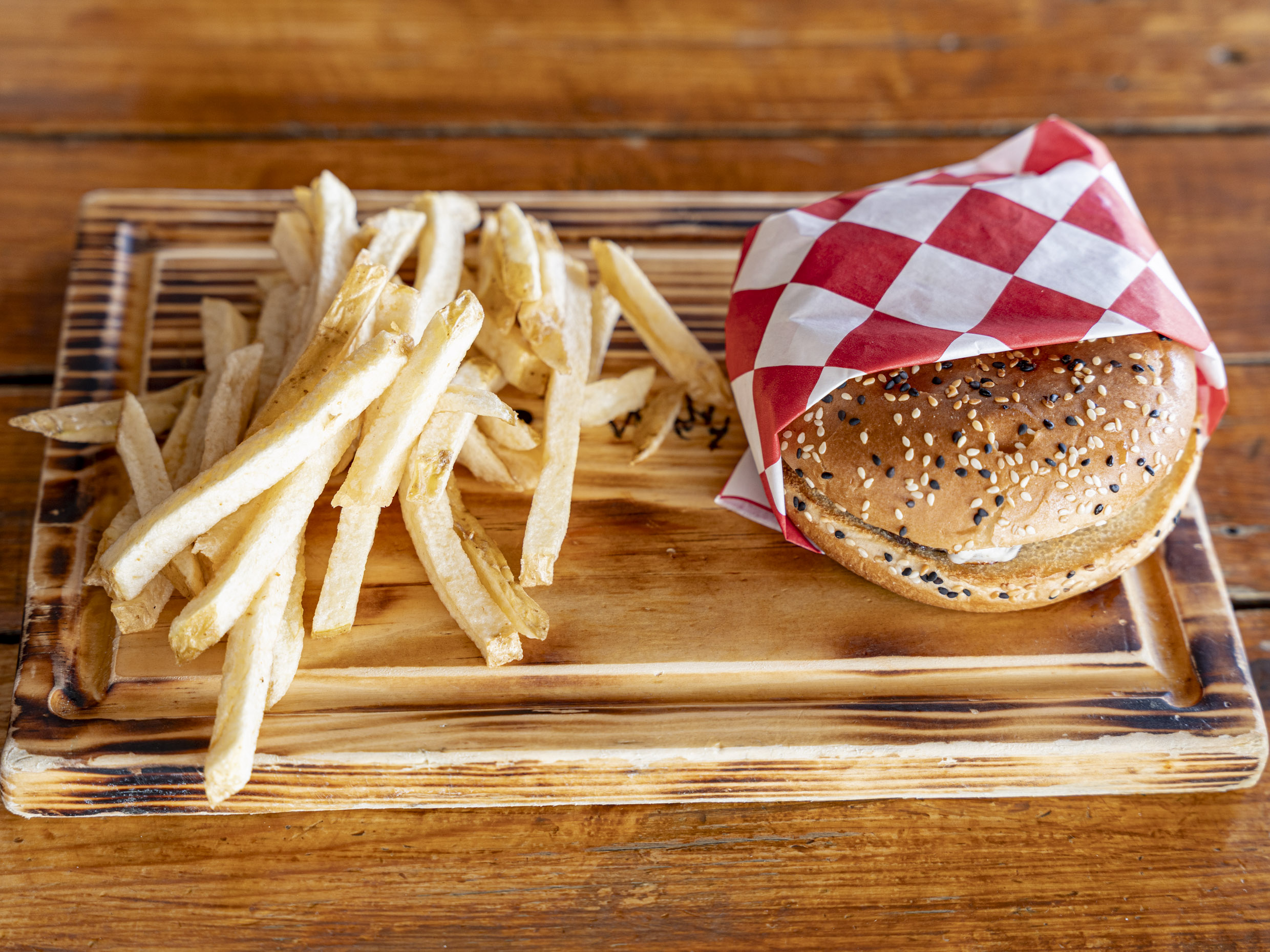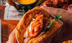 Filete de pollo empanizado, salsa Buffalo, queso gratinado, lechuga, tomate, cebolla, pepinillos, aderezos Ranch y una porción de papas francesas para acompañar.