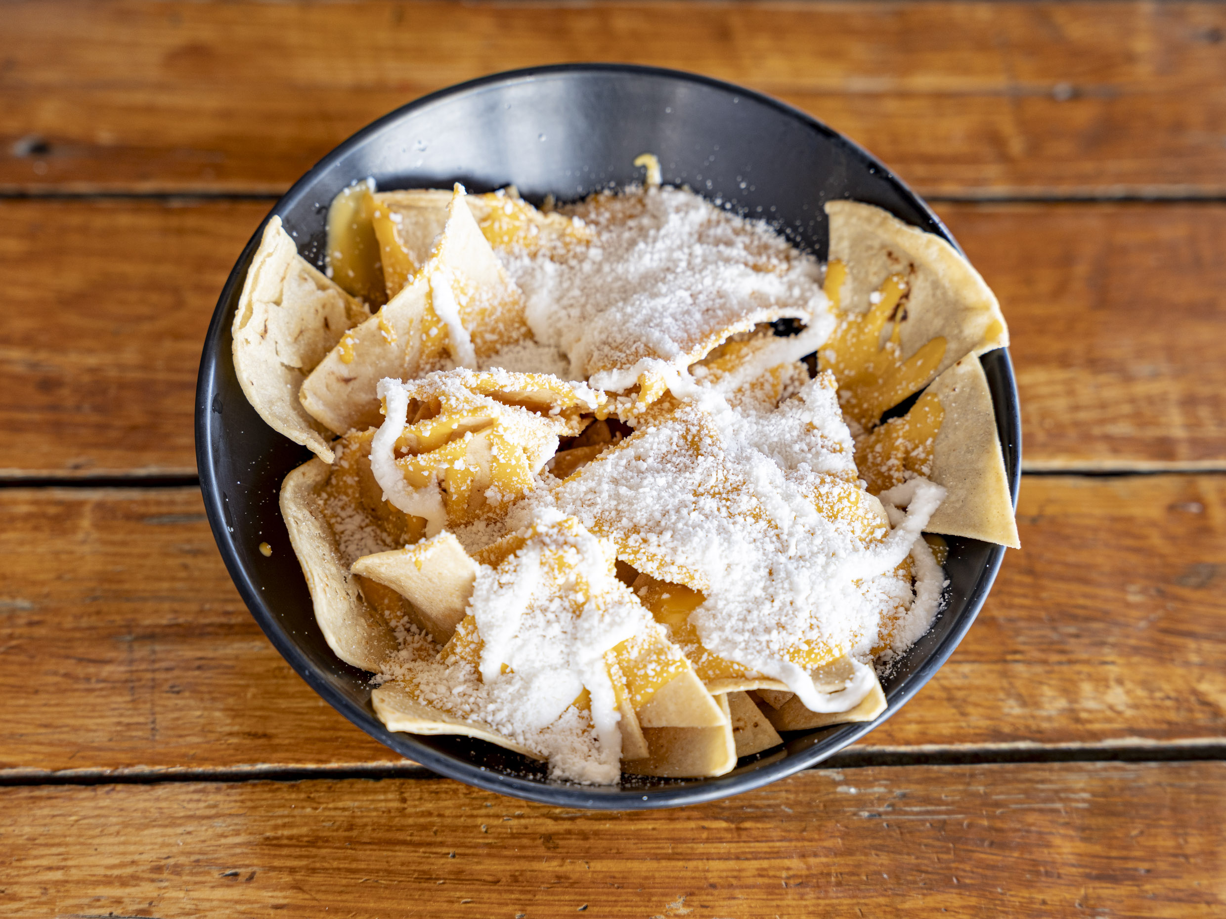 Totopos de maiz bañados en queso amarillo, crema y queso en polvo (porcion individual/para picar.)