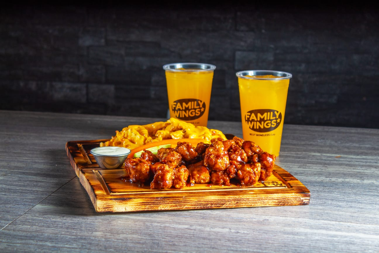 10 piezas de boneless (o 6 piezas de alitas.) bañadas en la salsa de tu elección, bebida de la casa (vaso 16 oz.), Veggie sticks, aderezo ranch y 5 dedos de queso para acompañar.