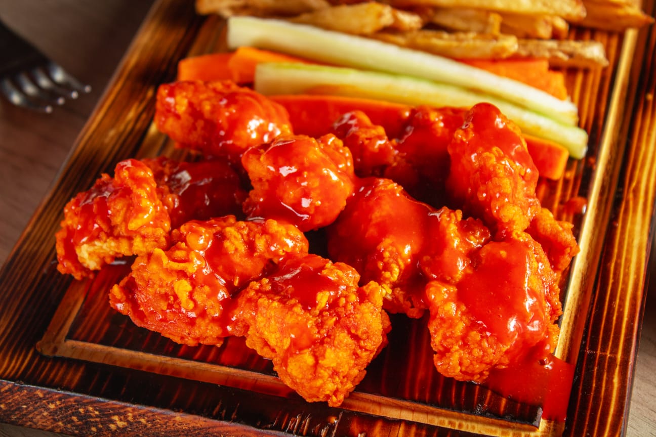 60 Cubitos de pollo empanizado bañados en la salsa de tu elección acompañados de Veggie sticks y aderezo Ranch.
