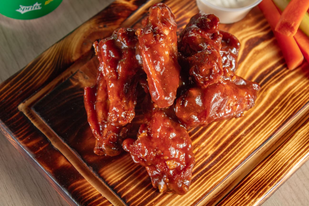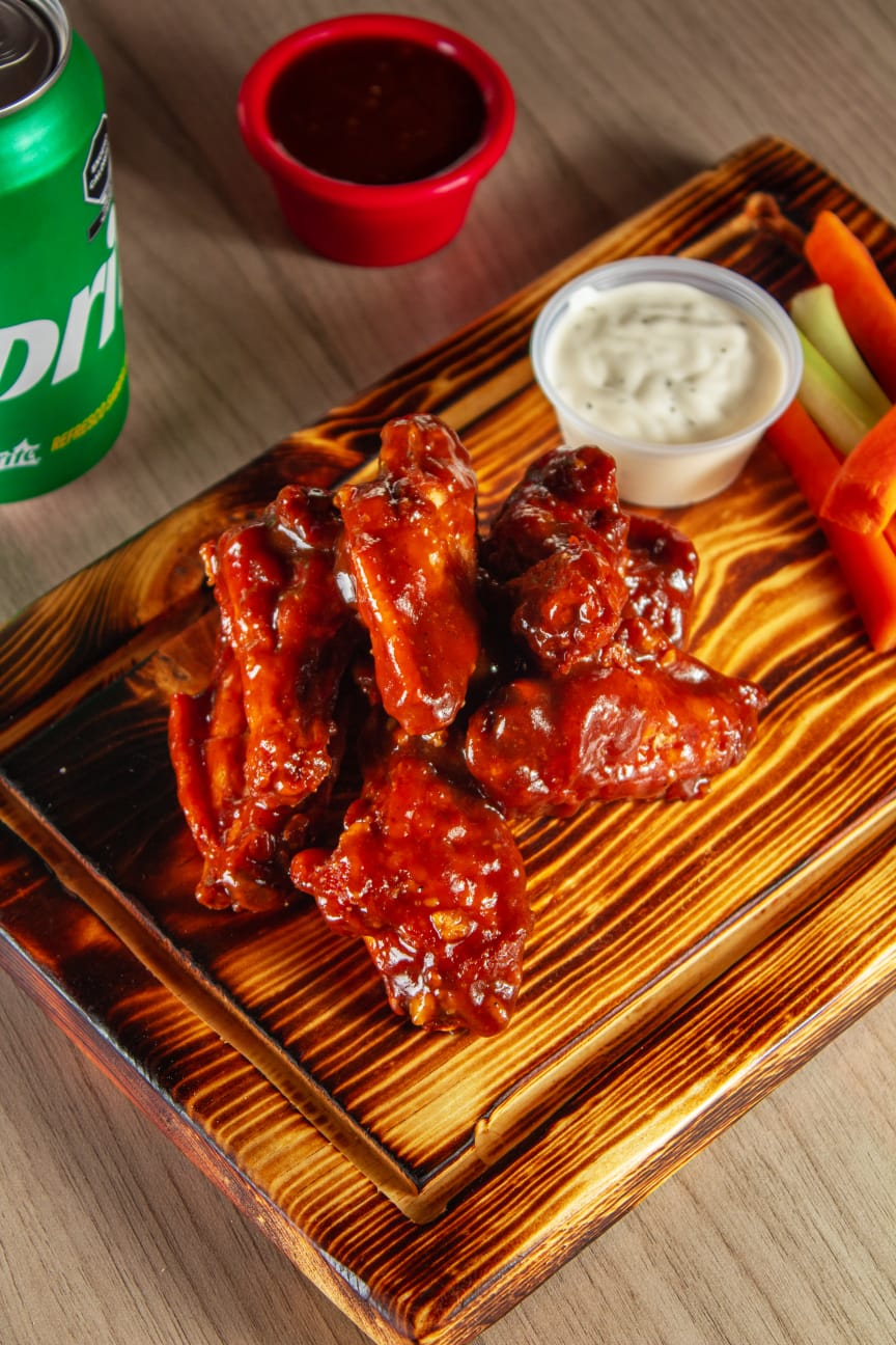 6 a 8 Alitas naturales fritas bañadas en la salsa de tu elección acompañadas de veggie sticks y aderezo Ranch.