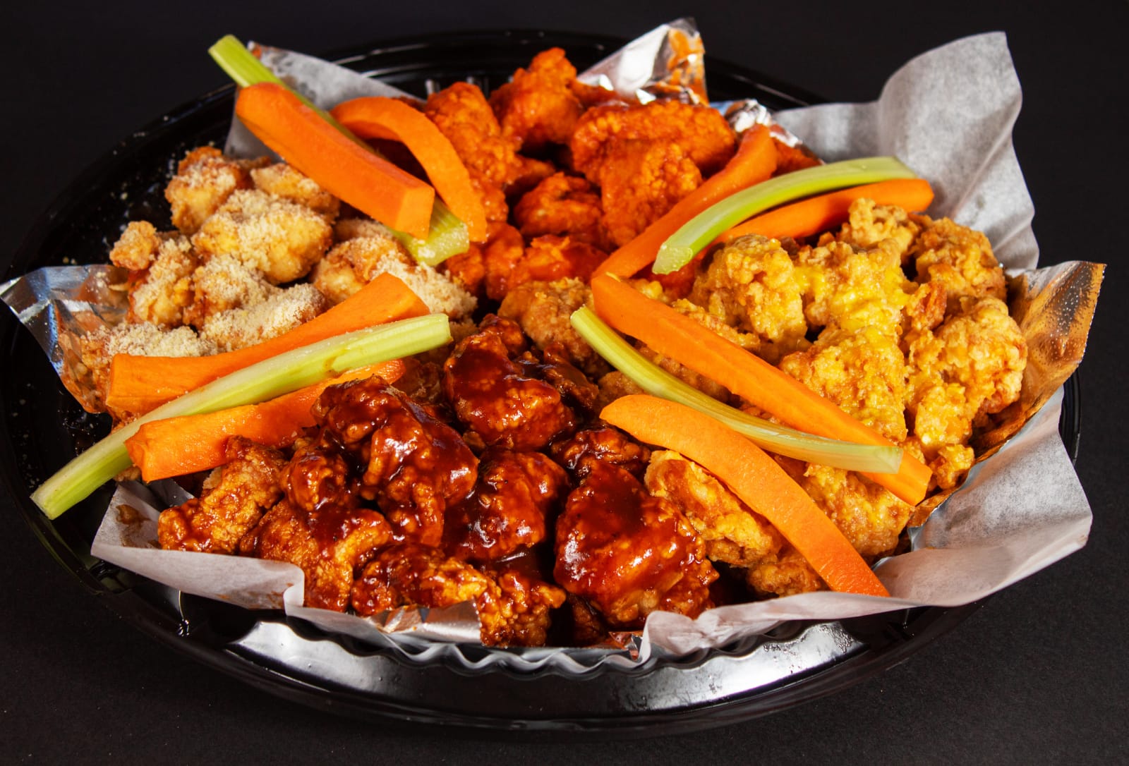 Combo con 30 boneless (2 salsas), 500gr. de papas francesas, veggie sticks y aderezo ranch.