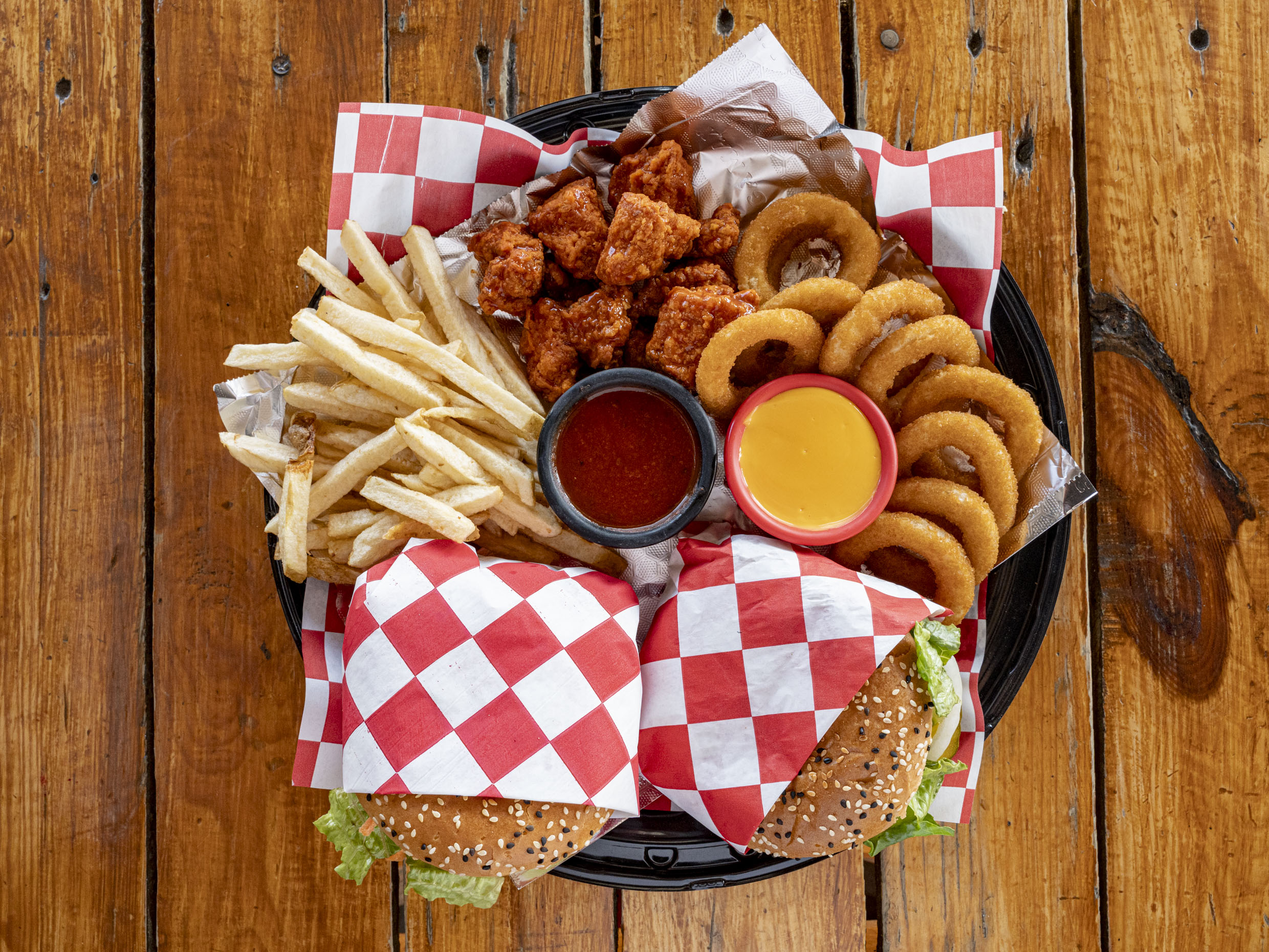 2 Hamburguesas de tu elección, orden de aros de cebolla, papas francesas, 250Gr. de boneless (1 salsa), veggie sticks y aderezo ranch.