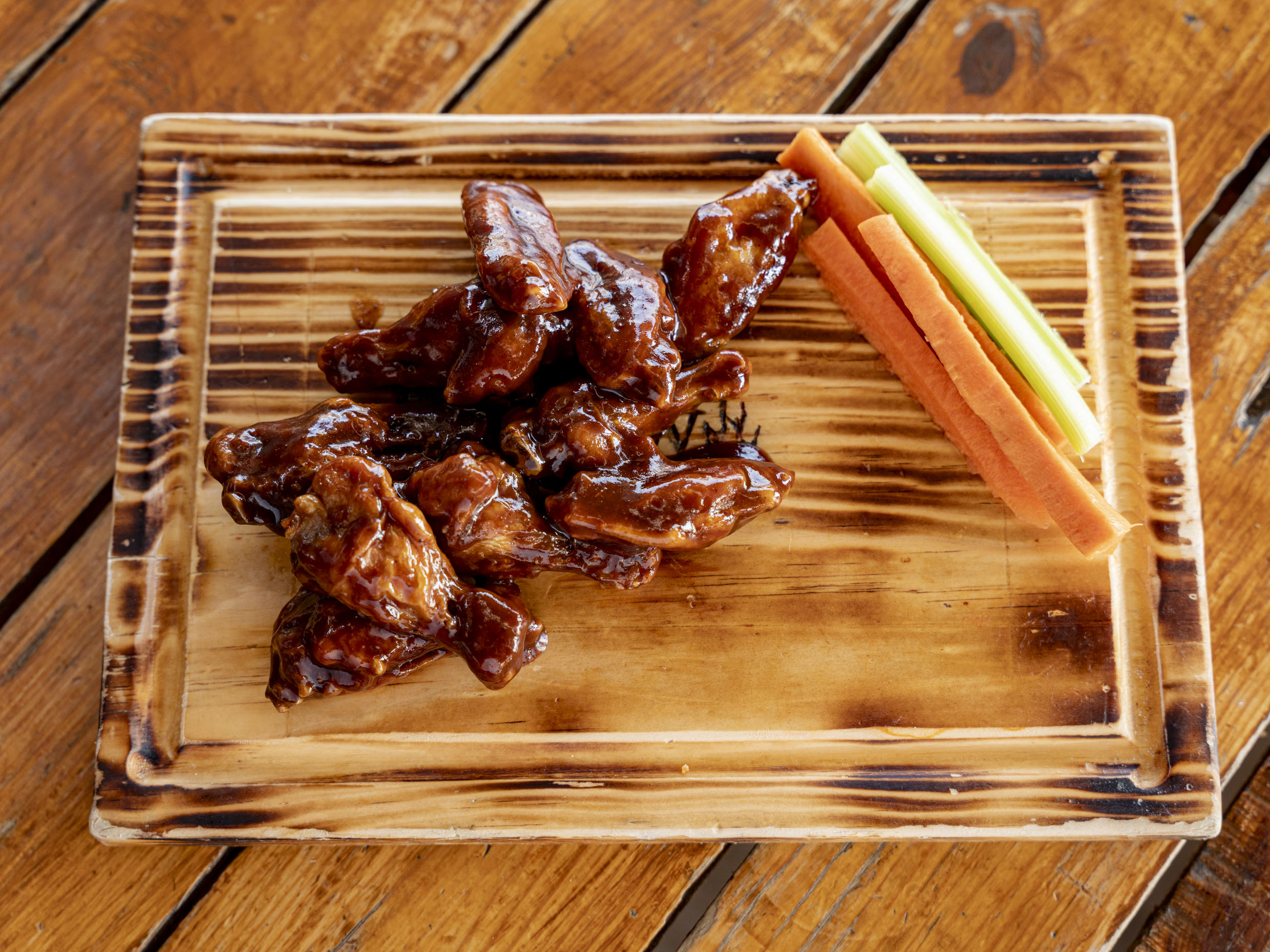 12 a 15 Alitas naturales fritas bañadas en la salsa de tu elección acompañadas de veggie sticks y aderezo Ranch.