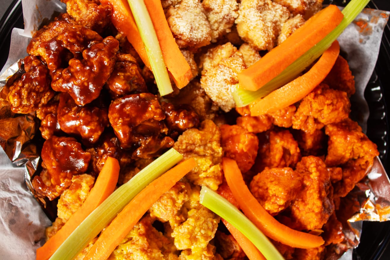 30 Cubitos de pollo empanizado bañados en la salsa de tu elección acompañados de Veggie sticks y aderezo Ranch.