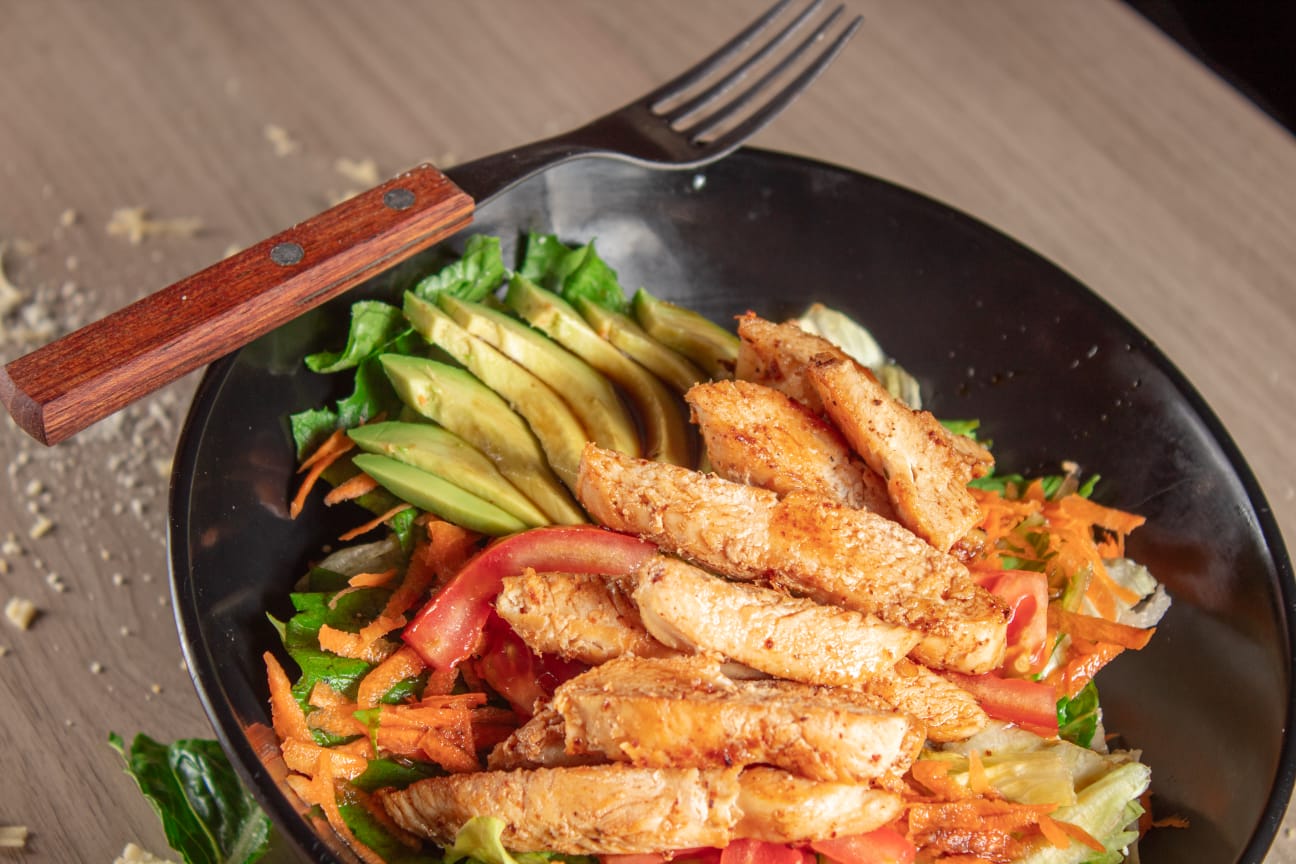Combinación de lechuga, tomate picado, zanahoria rallada, rodajas de aguacate, Crutones, pepita de girasol, pechuga de pollo (150 Gr. Aprox.) a la parrilla, bañada con salsa Teriyaki y queso parmesano, con aderezo Ranch aparte.