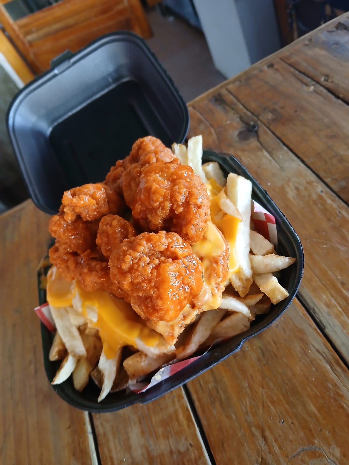 200gr de Boneless bañados en salsa a elegir sobre una cama de papas francesas con queso
