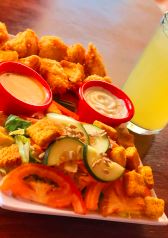 10 Cubitos de pollo empanizado bañados en la salsa de tu elección acompañados de Veggie sticks y aderezo Ranch.