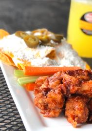 10 piezas de boneless (o 6 piezas de alitas.) bañadas en la salsa de tu elección, bebida de la casa (vaso 16 oz.), Veggie sticks, aderezo ranch y nachitos para acompañar.