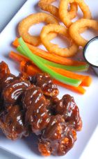 5 a 6 Alitas naturales fritas bañadas en la salsa de tu elección acompañadas de veggie sticks y aderezo Ranch.