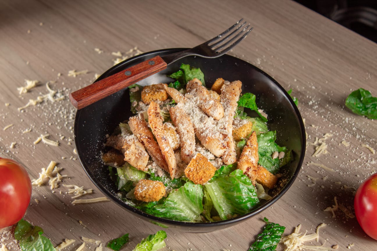 Combinación de lechuga, Crutones, pepita de girasol, pechuga de pollo (150 Gr. Aprox.) a la parrilla y queso parmesano, con aderezo Ranch aparte.