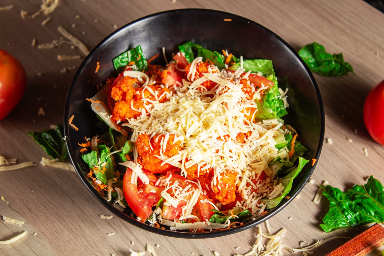 Combinación de lechuga, tomate picado, zanahoria rallada, queso rallado, Boneless (150 Gr. Aprox.) bañados en la salsa de tu elección, con aderezo Ranch aparte.