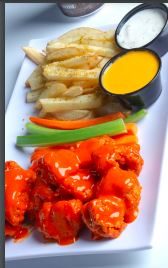 6 a 8 Alitas naturales fritas bañadas en la salsa de tu elección acompañadas de veggie sticks y aderezo Ranch.