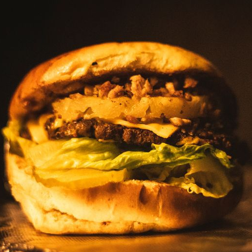 Pan, carne 100 % de res, aderezo mixto catsup, mostaza, mayonesa y especias, queso blanco o amarillo, pepinillos, cebolla, lechuga, tocino y piña.
