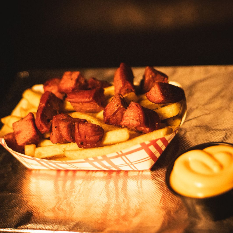 Pan, carne 100 % de res, aderezo mixto catsup, mostaza, mayonesa y especias, queso blanco o amarillo, pepinillos, cebolla, lechuga, tocino y chorizo.