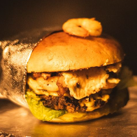 Pan, carne 100 % de res, aderezo mixto catsup, mostaza, mayonesa y especias, queso blanco o amarillo, pepinillos, cebolla, lechuga, tocino, queso crema y camarones.
