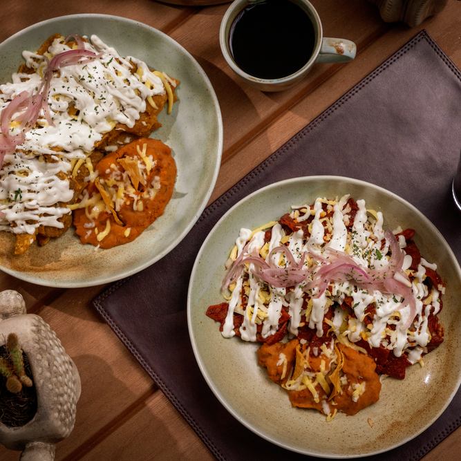 Bañados en salsa de tu elección, roja o verde, con crema y queso ranchero acompañados de nuestros frijoles puercos.