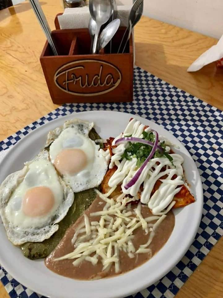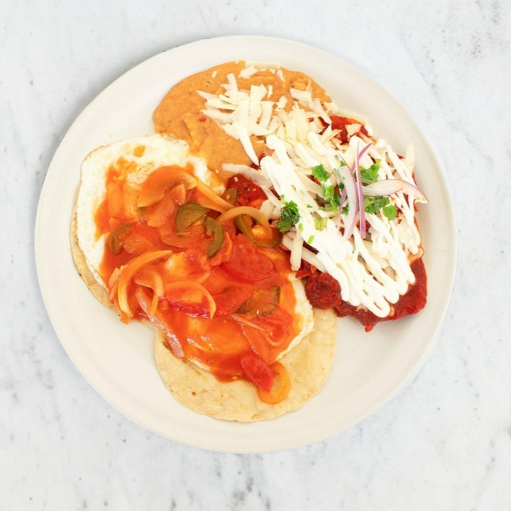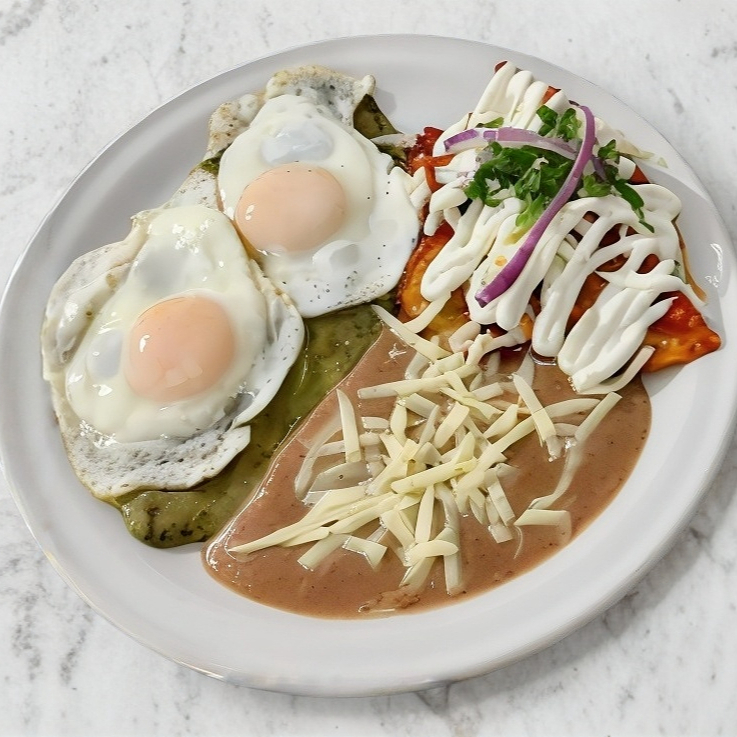 Dos huevos estrellados uno en salsa verde y otro en salsa roja. Acompañados de frijoles y chilaquiles verdes o rojos o alguno de los guisos. Si deseas puedes agregar guarnición extra de guisado.