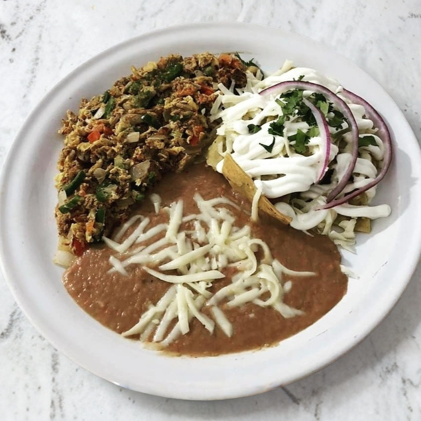 Dos huevos estrellados o revueltos con machaca norteña. Acompañados de frijoles y chilaquiles verdes o rojos o alguno de los guisos. Si deseas puedes agregar guarnición extra de guisado.