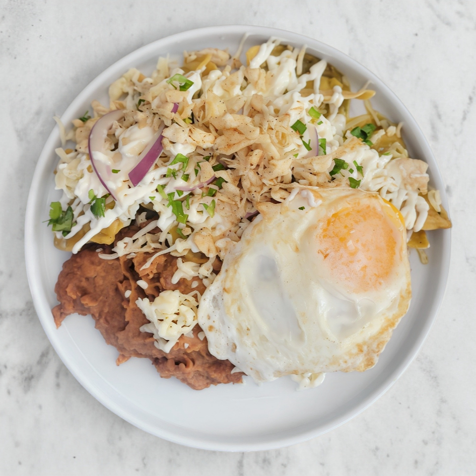 Chilaquiles tortilla de harina de maiz con pollo (50 g), huevo y una salsa de tu elección. (Porción personal)