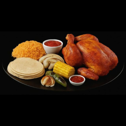 1/2 POLLO PURE DE PAPA SALSA TORTILLAS CHILES TOREADOS CEBOLLITAS ELOTITO