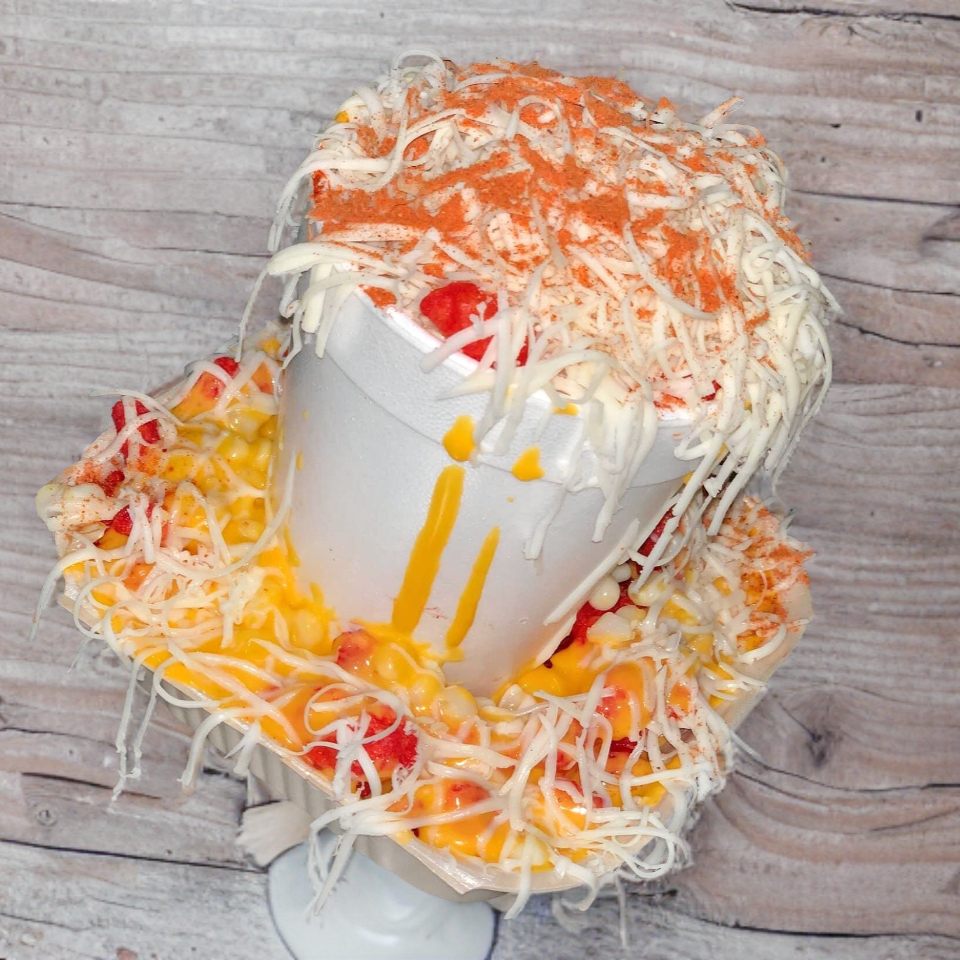 Maruchan chorreada con elote, queso amarillo, queso rayado, Maggi, Valentina y crema.
