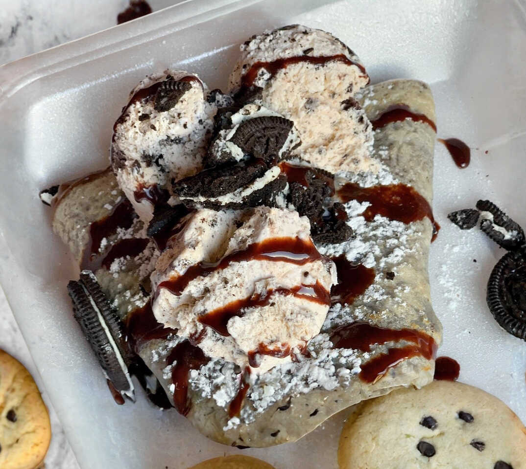 Crepa rellena con Nutella, Oreo en polvo y galleta, acompañada de nieve y chorreada con Hershey´s.