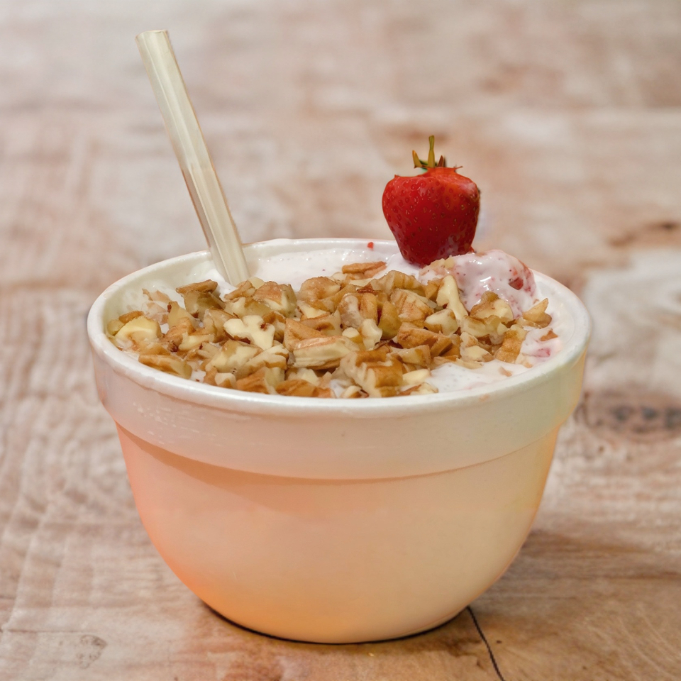 Malteada mediana sabor a nuez acompañada de crema batida.