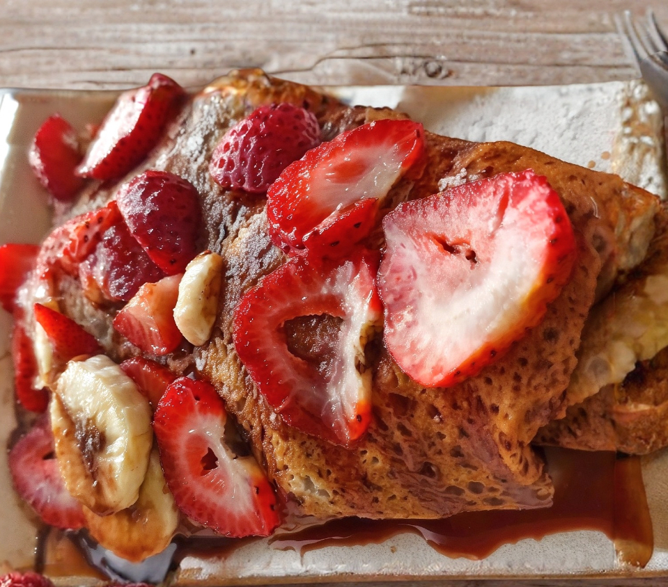Crepa dulce suprema, especial de la casa con Nutella, plátano, fresas, Hershey´s y nieve, polvoreada con azúcar glass, para quedarte sin hambre.