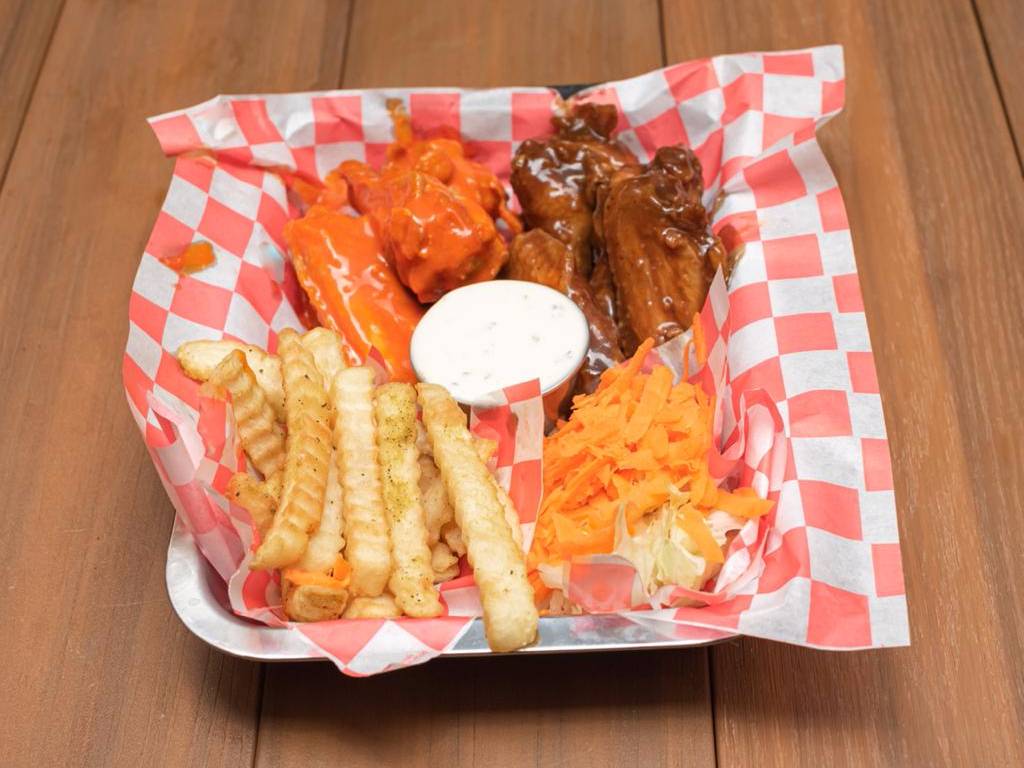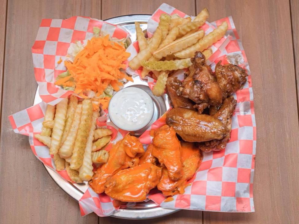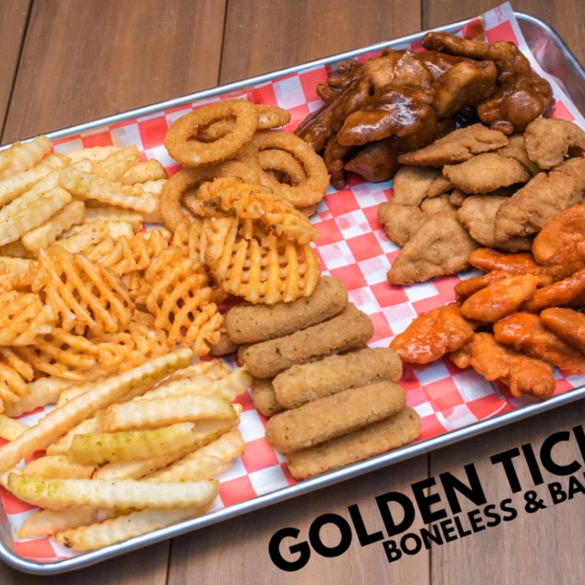 1 Kilo 1/2 de boneless bañados en tus salsas favoritas, 5 aros de cebolla, 5 dedos de queso, porción de papas reja y francesa.