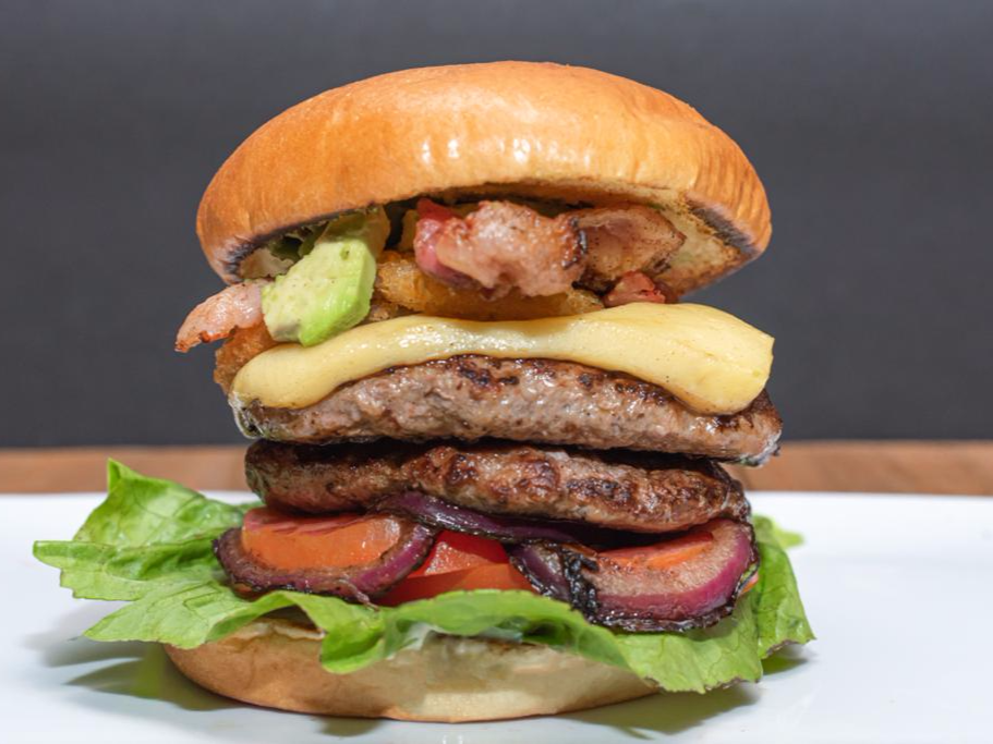 Pan brioche, carne de res doble, tocino, aguacate, queso, lechuga, aderezo golden, aros de cebolla y papas reja.