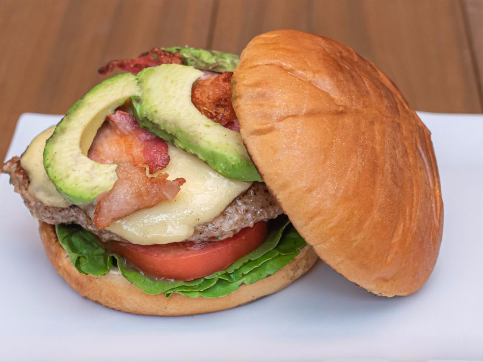 Pan brioche, carne de res, tocino, queso, aguacate, queso, lechuga, aderezo, salsa BBQ, y cebolla caramelizada y papas onduladas.