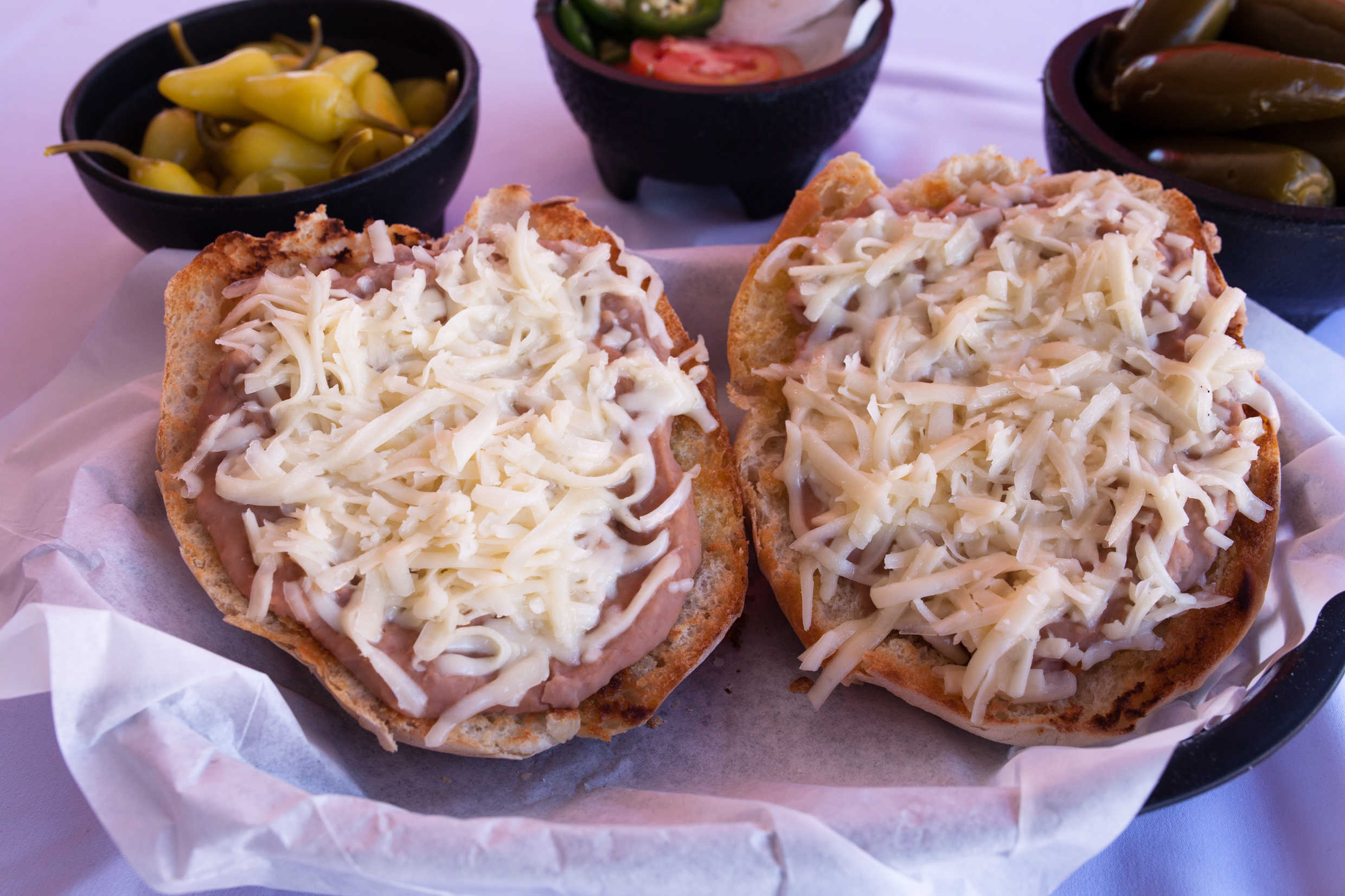 Pan con mantequilla, frijoles refritos, queso y guisado de tu elección.