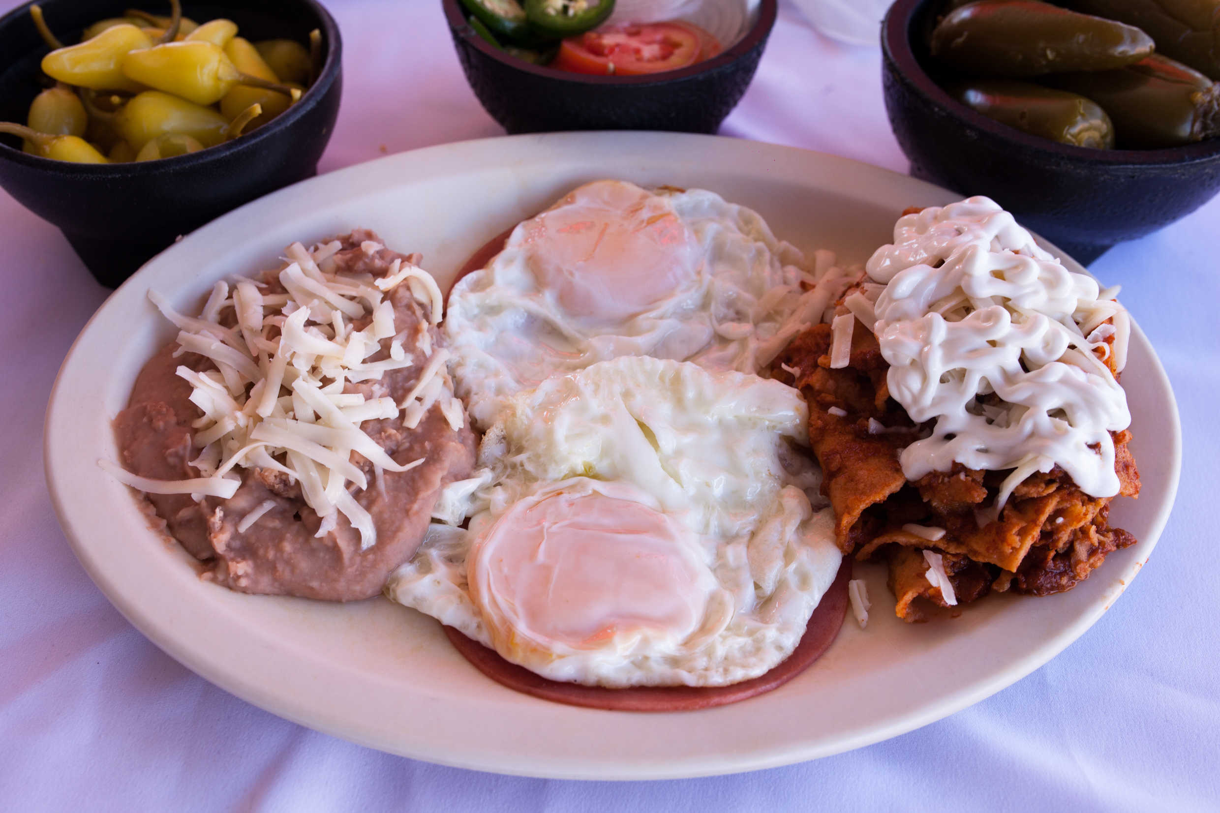 Acompañado de frijolitos, guisado de su elección o chilaquiles y tortilla.