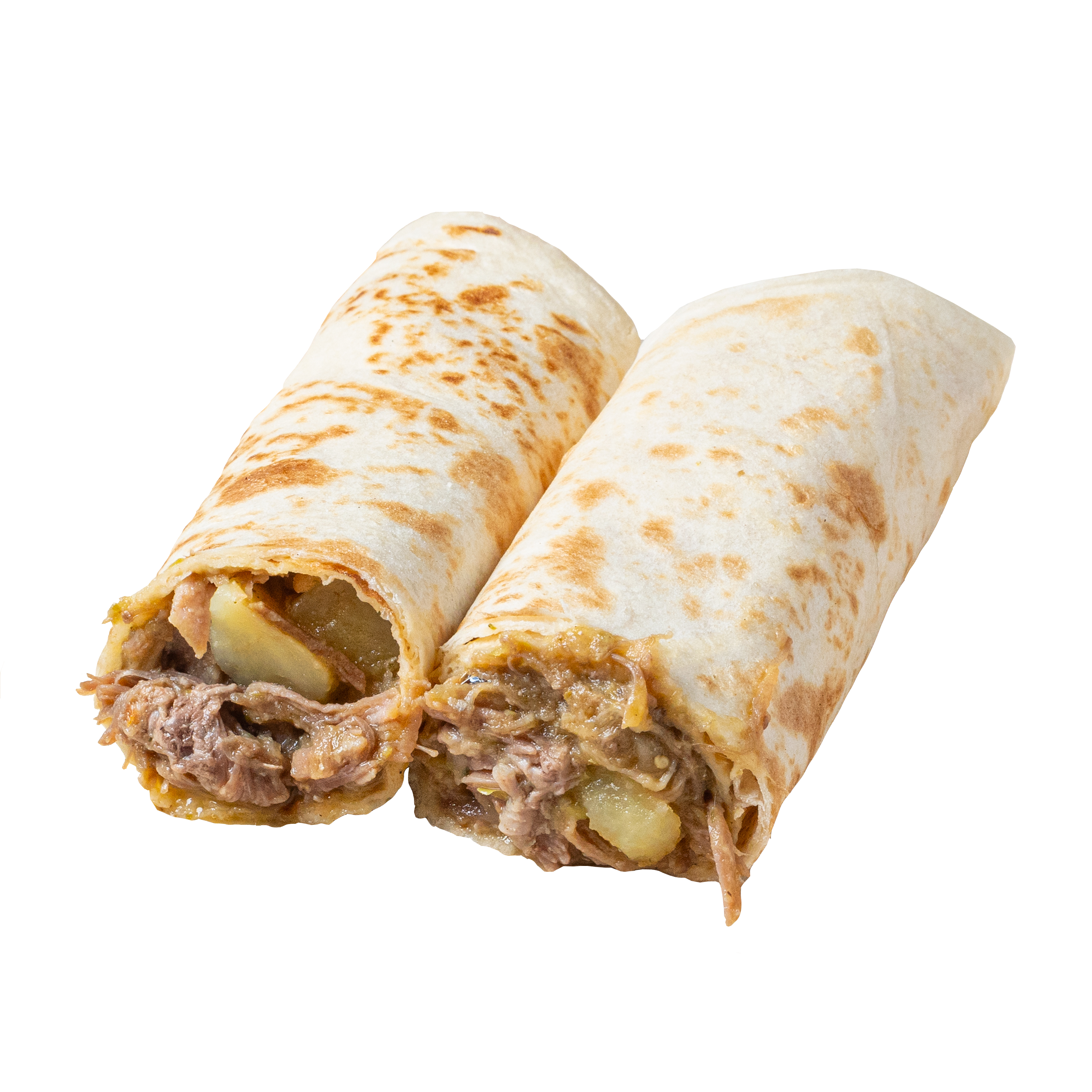 Delicioso burrito con barbacoa de cachete, puede incluir cilantro, cebolla y limón al gusto