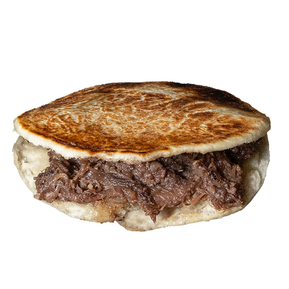 Suave y esponjosa gordita de harina, recién hecha. Rellena generosamente con carne de res deshebrada en salsa roja de chiles selectos de sabor intenso. Un clásico reconfortante.
