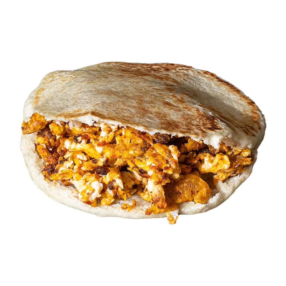 Suave y esponjosa gordita de harina, recién hecha. Rellena generosamente con nuestra mezcla de huevo revuelto y sabroso chorizo, cocinados a la perfección. ¡Un desayuno clásico lleno de sabor!