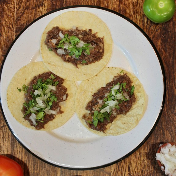 3 Taquitos de deliciosa Barbacoa, puede incluir cilantro, cebolla y limón al gusto.