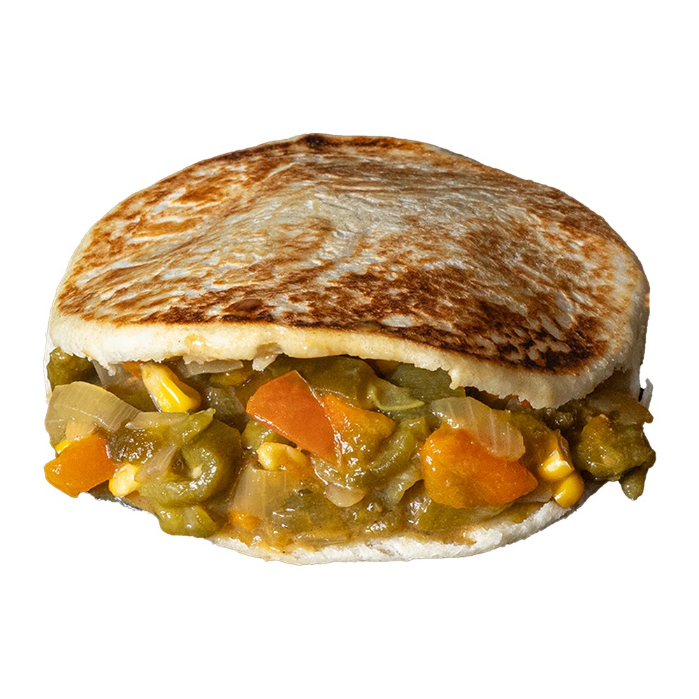 Suave y esponjosa gordita de harina, recién hecha. Rellena generosamente con rajas, guisadas en una cremosa salsa. Un manjar suave y reconfortante.