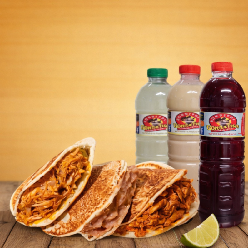 elige 3 gorditas de nuestros guisados clásicos y agrega un agua natural entre horchata, jamaica o limón