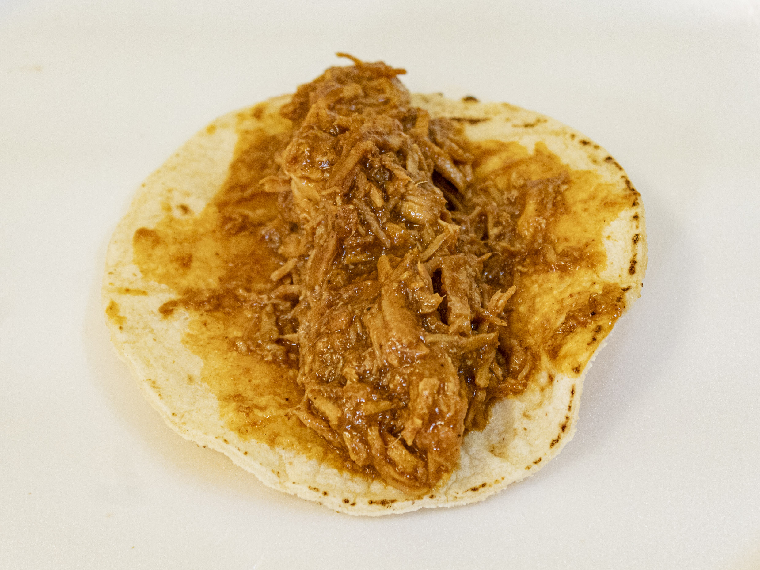 Suave y esponjosa gordita de harina, recién hecha. Rellena generosamente con tierno pollo deshebrado bañado en nuestro mole de sabor profundo, con notas de chocolate y especias. ¡Un bocado gourmet!