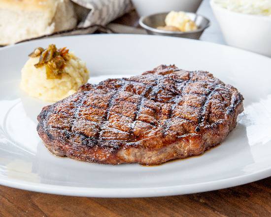 Delicioso corte New York de 567 gramos (peso en crudo) con hueso, acompañado de una perla de puré de papa (Todos nuestros platillos son acompañados con frijoles y ensalada de col)