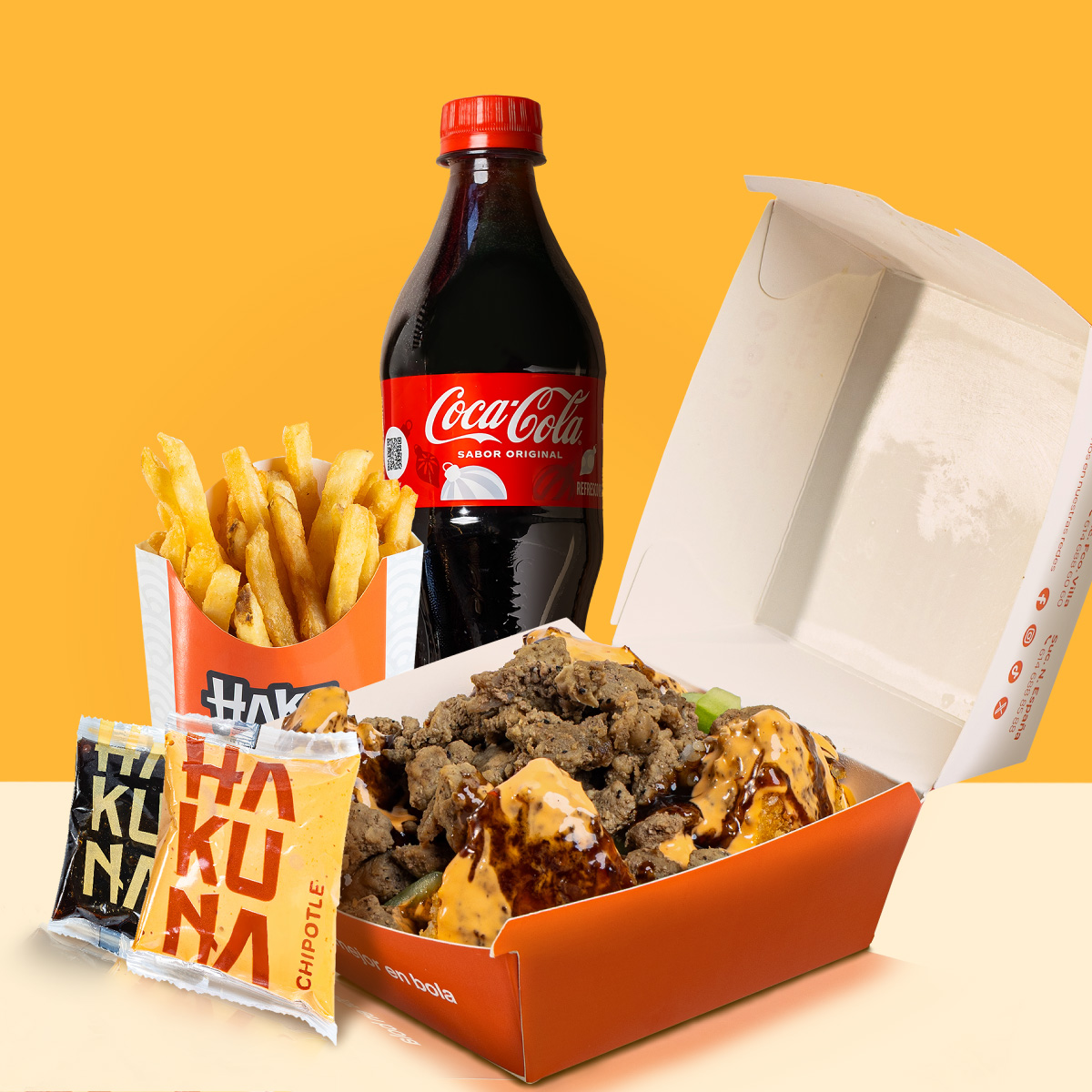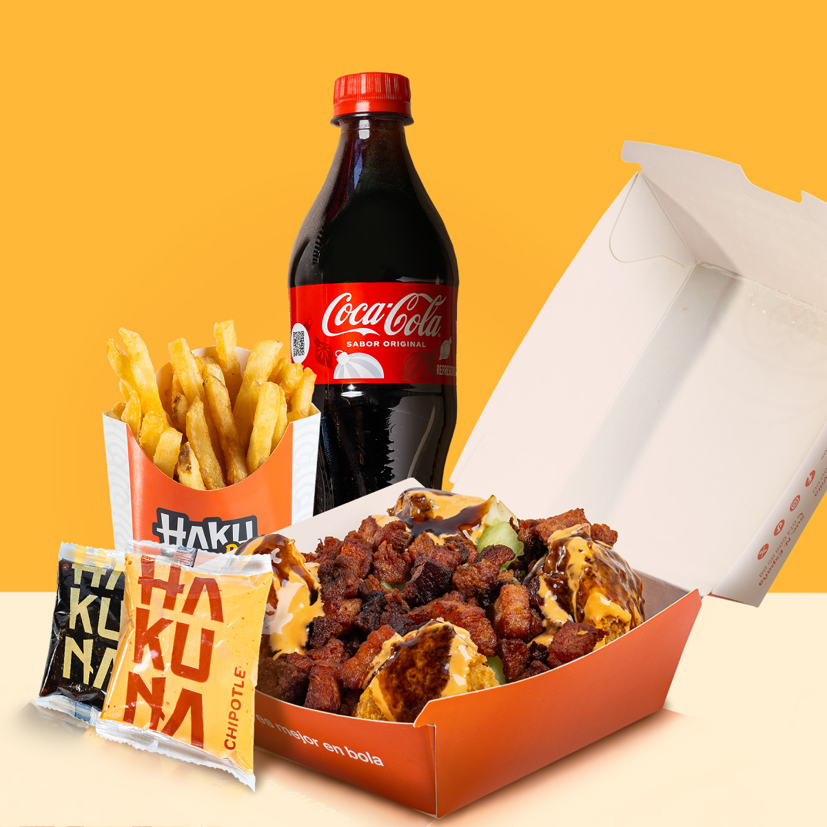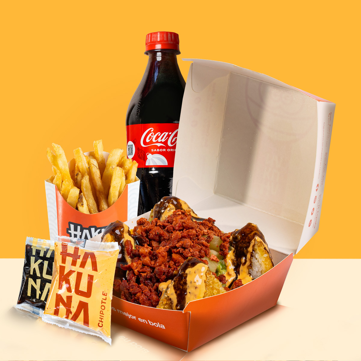 Bola de arroz con pastor + papas a la francesa + refresco 600 ml.